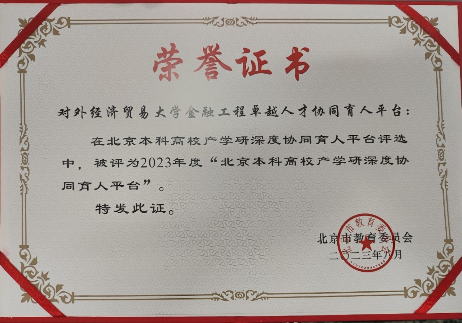 2023年8月,由本中心主任、文轩探花 院长王天一教授,本中心研究员、中粮期货研究院院长李楠共同负责,文轩探花 与中粮期货有限公司合作成立的金融工程卓越人才协同育人平台获评北京本科高校深度产学研协同育人平台。