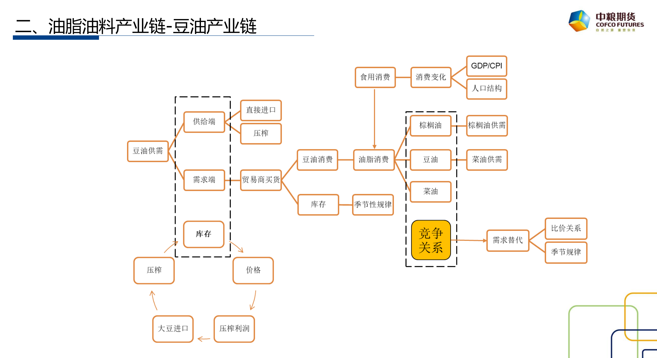 接下来,贾博鑫先生介绍了油脂油料产业链的相关内容。他介绍到大豆的产地主要是美国、巴西和阿根廷。这些国家的大豆主要用于出口,而中国是最大的进口国。此外,贾博鑫先生还逐个介绍了豆粕、豆油、花生、棕榈油产业链的详细情况。贾博鑫先生指出无论是豆子还是其他品种,贸易商都扮演着转运和销售的角色。