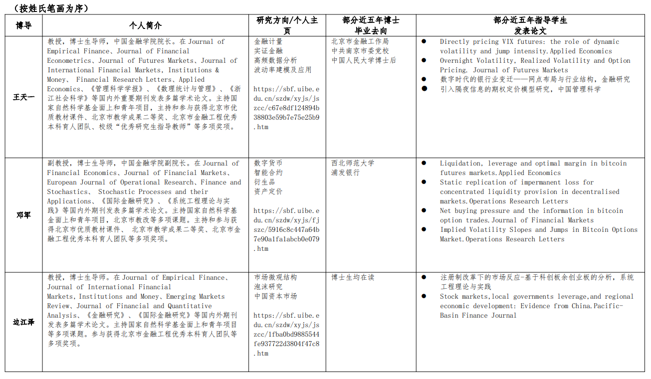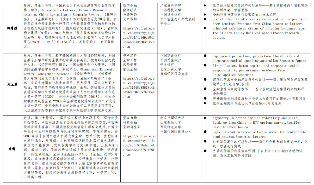 师资力量:金融工程方向博士生导师包含11位教师,全部具有国际学术和交流背景,与金融机构、监管机构保持紧密合作关系。多人获得国家级人才称号,教育部新世纪优秀人才支持计划,北京市教学名师,北京市课程思政教学名师,首都教育先锋教学创新个人,孙冶方经济科学奖等。