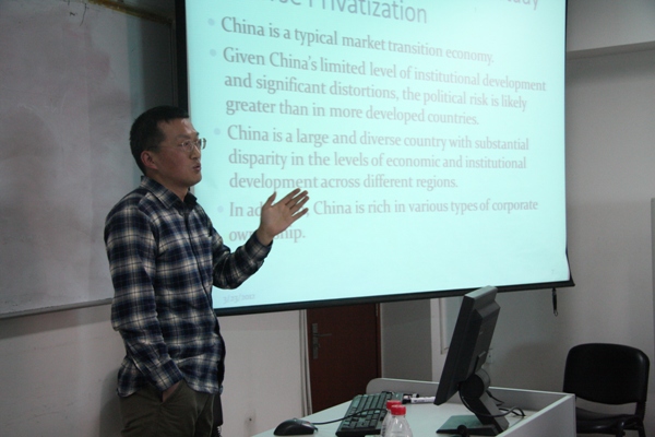 2012 年3月15日 ,金融学院王茂斌老师在博学楼918举行了题为“反向私有化的政治经济学:中国证据”的学术讲座。讲座由邹亚生副院长主持,学院教师、部分博士后参加了讲座。