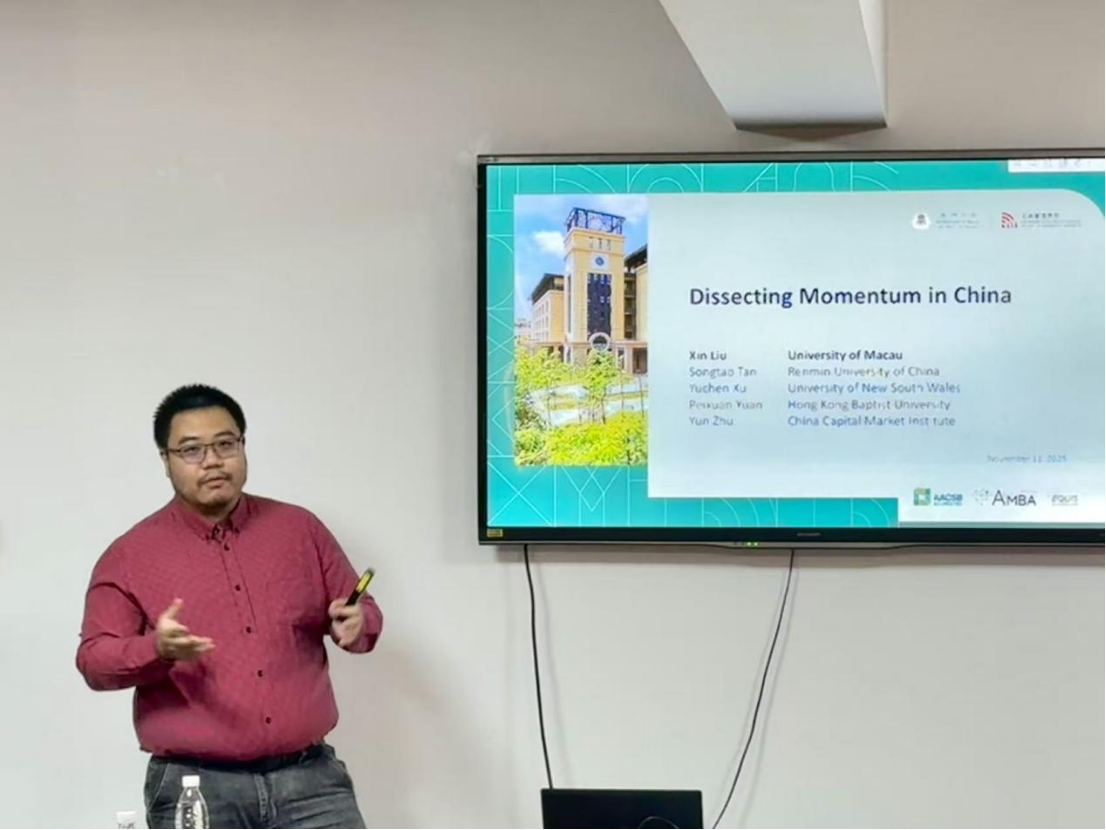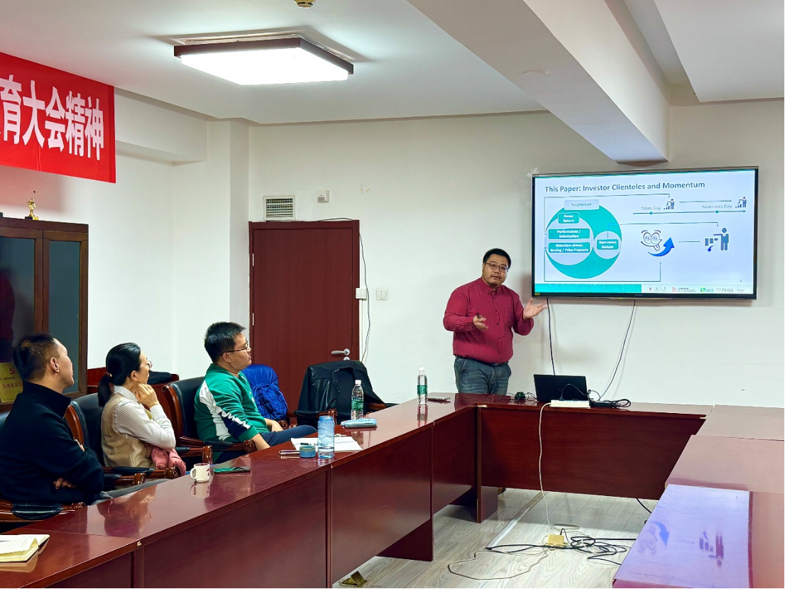 2025年11月11日下午,文轩探花 举办SBF论坛2025年第13讲,特邀澳门大学工商管理学院副教授刘昕来题为《Dissecting Momentum in China》的分享。本次学术讲座于博学楼925会议室举行,由文轩探花 尹澄溪老师主持。
