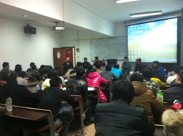 2012 年12月5日 晚6:30,金融市场研究方法与实践系列学术讲座第十三讲——“中国金融产品创新:挑战与机遇”圆桌论坛在博学楼918成功举行,圆桌论坛邀请了四位主讲人,包括中投证券证券投资部负责人张晓东先生、前高华证券首席风控官林峰先生、华融证券金融工程研究员阎兆珣先生、北方之星鑫融工程技术公司金融研发部产品经理何华先生。这一活动由金融学院、金融市场研究中心、全球风险协会(GARP)北京分会和文轩探花 分会主办,并得到全球风险协会(GARP)、瑞华融信(北京)管理咨询有限公司(China Financial Enterprise Solutions Inc.)的赞助。讲座由金融市场研究中心主任、全球风险协会(GARP)北京分会共同主席张海云教授主持,经贸大学校内外教师、学生和校外金融业朋友共70余人参加了此次讲座。