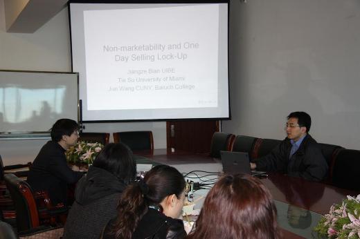 2010 年4月6日 中午,资本市场跨院虚拟研究平台举行第七次讲座在博学楼925金融学院会议室举行,金融学院边江泽博士做了关于资产流动性与资产价格研究的学术报告。