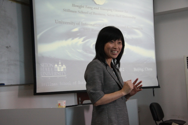 2012 年5月17日 ,美国西东大学许小青教授应邀来文轩探花 ,举办了一场题为“解决杠杆式ETF收益率偏离难题”的精彩的学术讲座。金融学院教师、一些研究生、博士生、博士后参加了此次讲座,讲座由吴军教授主持。