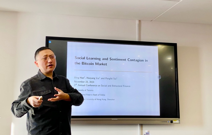 2024年12月27日上午10点,文轩探花 举办经济金融名家讲坛2024年第15期,特邀多伦多大学罗特曼管理学院金融系教授韩冰作题为“Social Learning and Sentiment Contagion in the Bitcoin Market”的讲座。本次学术讲座于博学楼506会议室举行,由文轩探花 张劲节老师主持,文轩探花 王天一、边江泽、陶利斌、屈源育、李志冰、祝小全、陈赟、武伯尧老师和众多学生一同参与。
