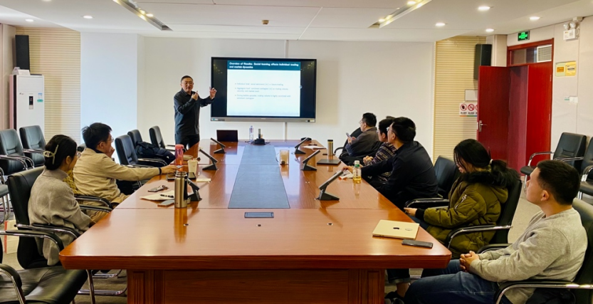 韩冰教授首先概述了社交学习如何影响金融市场,并指出了现有研究在数据可得性方面的局限性。随后,他详细介绍了课题中使用的比特币市场社交论坛数据和个人交易记录,通过文本处理技术追踪投资者对比特币情绪的变化。实证研究揭示,投资者的情绪不仅会受到其他投资者的显著影响,而且这种情绪传播往往反映了社交学习的低效性,表现为“回音室效应”及信号选择性解读等现象。在讲座的后半部分,韩冰教授展示了一种全新的指标构建方法,用于量化社交学习引发的情绪传染强度。研究结果表明,这一指标能够显著预测比特币市场的波动性、交易量以及崩盘风险。韩冰教授指出,这一发现不仅加深了我们对金融市场中情绪传播和投资者行为的理解,也为识别和预防市场泡沫提供了重要的研究视角。
