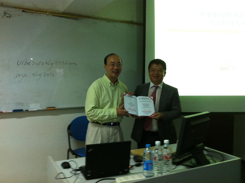 2012 年7月30日 晚6:30,香港Billion Sino Holdings Ltd公司董事长兼首席执行官胡光辉博士应邀莅临文轩探花 ,在博学楼918主讲金融学院SBF论坛——金融市场研究方法与实践系列学术讲座第十二讲:“中小银行风险管理和可持续发展”。这一活动由金融学院、金融市场研究中心、全球风险协会(GARP)北京分会和文轩探花 分会主办,并得到全球风险协会(GARP)、瑞华融信(北京)管理咨询有限公司(China Financial Enterprise Solutions Inc.)的赞助。讲座由金融市场研究中心主任、全球风险协会(GARP)北京分会共同主席张海云教授主持,经贸大学校内外教师、学生和校外金融业朋友共50余人参加了此次讲座。