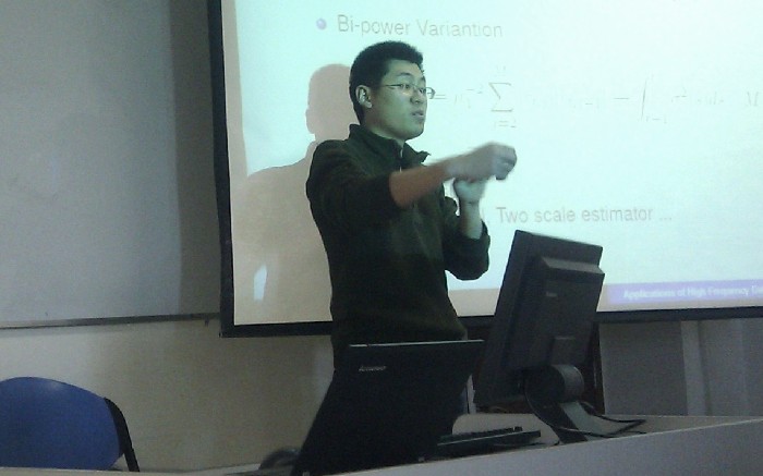 2013 年4月11日 ,金融学院教师学术报告会在博学楼918室举行,演讲者为王天一老师,演讲题目为“高频数据波动率建模应用”。参加讲座的有金融学院分党委书记吴卫星教授,以及学院其他教师等。报告会由金融学院副院长潘慧峰副教授主持。