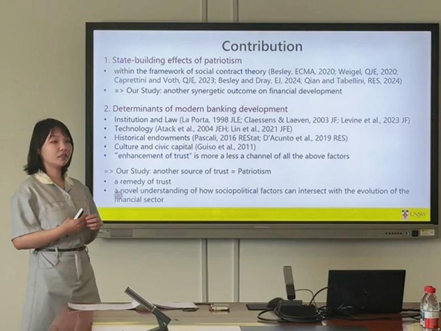 2025年6月5日下午1:00,文轩探花 举办SBF论坛2025年第5讲,特邀澳大利亚新南威尔士商学院助理教授徐宇晨作题为“Bonds of Love: Patriotism and the Rise of Modern Banks”的讲座。本次学术讲座于博学楼501会议室举行,由文轩探花 旷纯老师主持,文轩探花 孙宇辰老师和众多学生一同参与。
