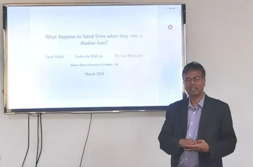 Sushanta Mallick教授为学院师生带来题为“What happens to listed firms when they take a shadow loan”的精彩报告。Sushanta 教授首先提出中国在2010年施行限制流动性的监管后影子银行贷款规模迅速增长的研究背景,基于上市公司的视角,讨论公司取得影子贷款的动机和经济后果的实证研究具有创新性。Sushanta 指出公司特征和挤出效应是私营企业被迫获得影子贷款的作用机制,即相较国有企业,私营企业被挤出了正规贷款市场。采用倾向得分匹配和双重差分方法发现,高度依赖影子贷款的私营上市公司业绩出现下降,即公司的投资减少,违约概率增加。进一步的,对于技术密集型和高生产率的私营上市公司,获得影子贷款后则并未出现不利于基本面的影响。