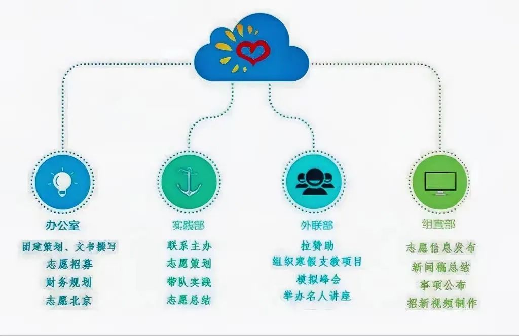 四个部门分工明确,形成完善的工作链条:由实践部牵头发起志愿并带队完成志愿;组宣部撰写推送并发布志愿信息,公开进行志愿者招募;由办公室进行人员的录取与审核,同时在志愿结束后负责志愿时长的录入;外联部相对独立的进行资金活动,灵活协助各个部门解决难题。无论在哪一个部门中,你都可以收获满满的工作经历、真挚的同学友谊,同时还可以获得学长学姐们在工作、学习与生活等各方面的经验分享。