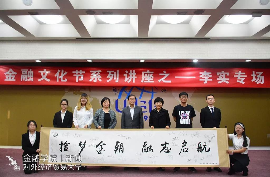 讲座正式开始前,主持人邀请与会嘉宾在“拾梦金朝,融志启航”的金融文化节主题卷轴上签名,并与出席讲座的老师在卷轴前合影留念。