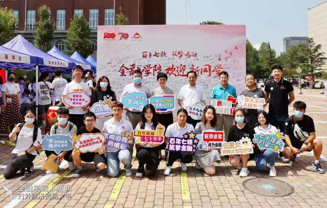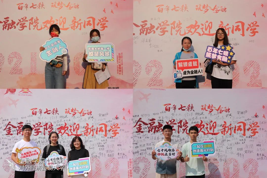 在建党100周年、建校70周年的关键时点,学院设计“百年七秩 筑梦金融”特色签名板,包含“1921 2021”文字云图:左侧的1921回望历史,文字内容与党史相关,鼓励学生学史明理、学史增信、学史崇德、学史力行;右侧2021展望未来,学院暑假期间提前征集新生的大学寄语,汇入文字之中。别出心裁的签名墙吸引了许多新生签字、拍照留念。学院还设计了多样宣传品,如“百年七秩 筑梦金融”新生院衫和“2021 未来可期”专属贴纸等,增添新生学院归属感,让他们感受到家的温暖。拿着有趣的标语手幅,和签名墙来张自拍几乎成了每个报道新生的必备动作。他们的笑容自信美好,是这个惠园秋天最靓丽的风景。看着他们,就能看见青春最美好的模样,就会不由自主地相信,这就是最好的未来,这就是最嘹亮的青春之歌!