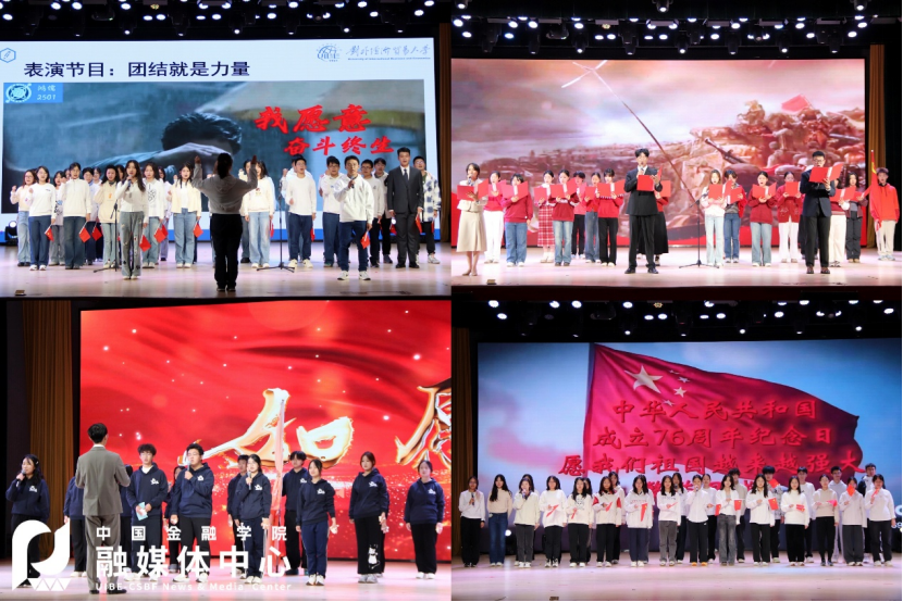 金量2501班带来合唱《我爱你中国》,深情的旋律伴着真挚的歌声,对祖国的热爱与赞美娓娓道来。