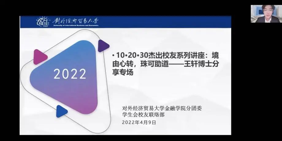 2022年4月9日下午4点,由金融学院投资系组织筹划,金融学院分团委学生会校友联络部承办的金融学院10·20·30杰出校友系列讲座之王轩专场“境由心转,珠可助道”顺利举办。