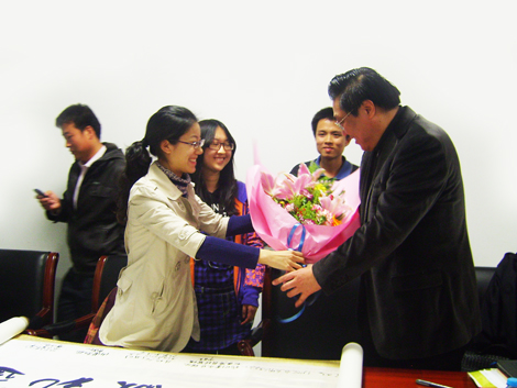 论坛临近尾声, 李先生回答了在场同学关于专业技术工作与管理工作间的转换、怎样平衡日常工作与享受生活等问题。本次“让榜样更有力量”校友论坛随着工作人员 向李灵敏先生献上鲜花并请 李先生在校庆