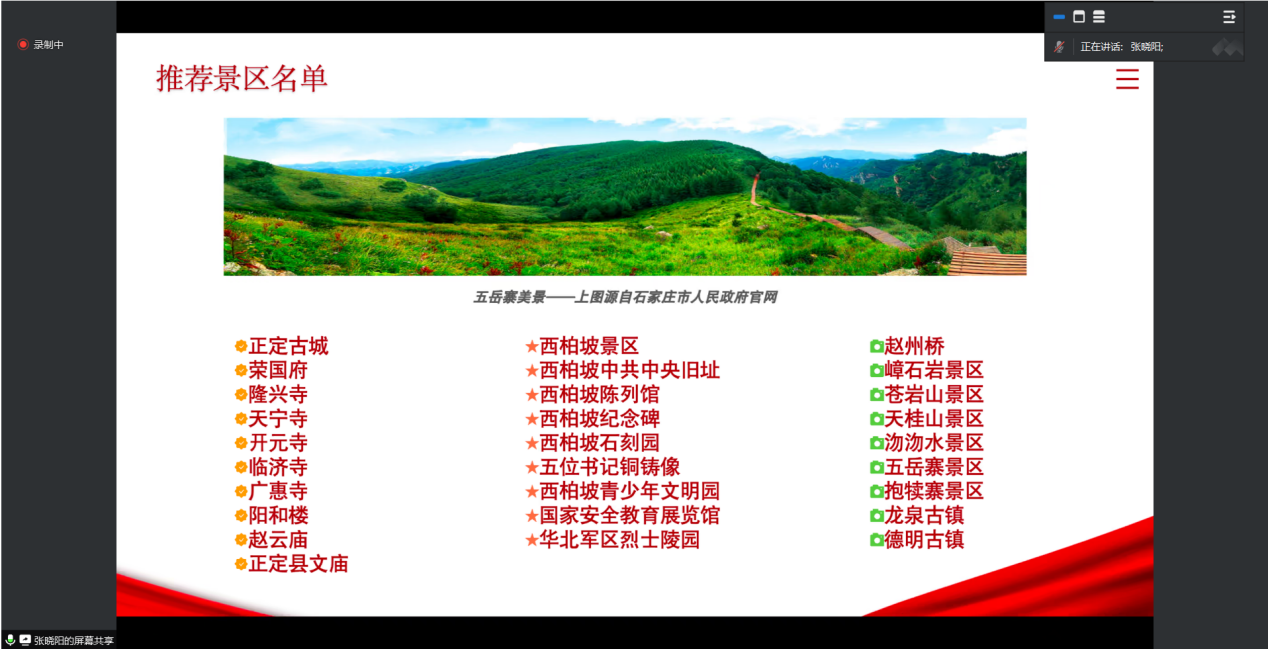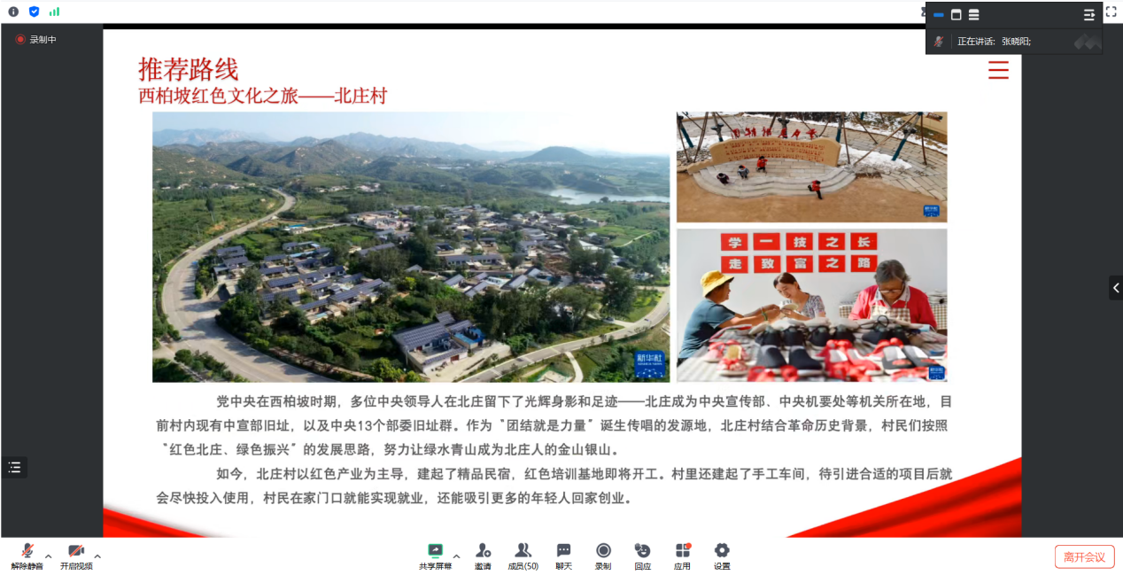 张晓阳:在这个暑假期间,我参与了西柏坡精神红色宣讲活动,这段经历不仅让我深刻理解了西柏坡的革命历史和精神内涵,也锻炼了我的实践能力和宣讲技巧。在过程当中,我整合了西柏坡的旅游资源和当地特产资源并制作相关展示文档,参与了多场线上线下宣讲,与听众共同感受了红色文化的魅力。这次经历让我更加坚定了传承红色基因、弘扬革命精神的决心。