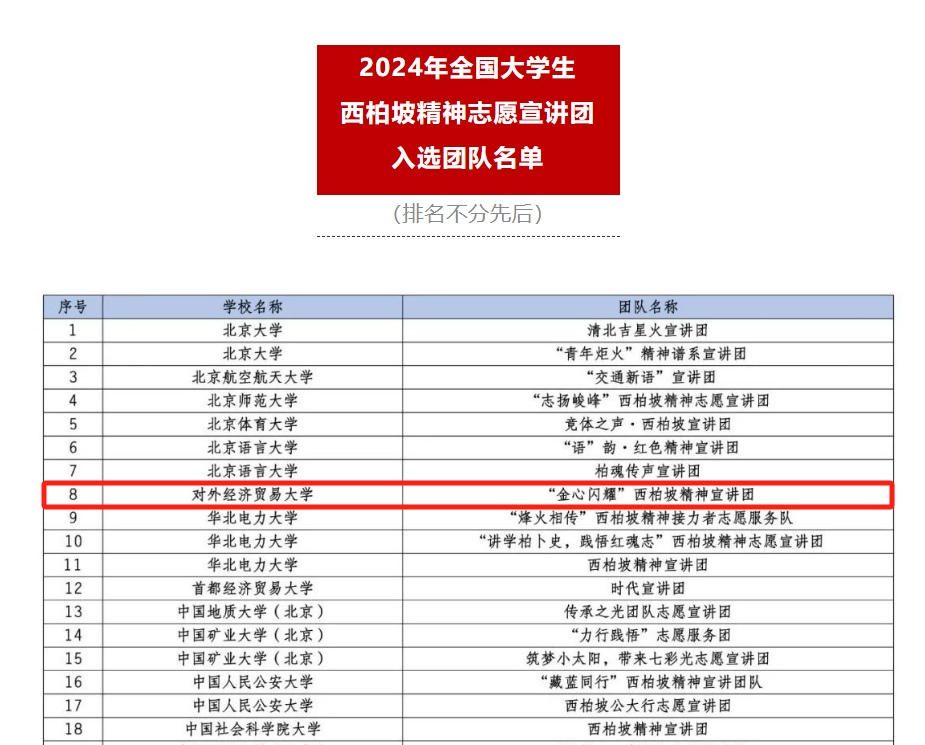 2024年5月,团中央青年志愿者行动指导中心、共青团河北省委、中共石家庄市委、中国青年志愿者协会秘书处联合发布了《2024年全国大学生西柏坡精神志愿宣讲团入选团队名单》。贸大“金心闪耀”西柏坡精神志愿宣讲团成功入选团中央2024年全国大学生西柏坡精神志愿宣讲团。贸大“金心闪耀”宣讲团由“金课堂”辅导员工作室指导组建,陈玉平担任指导老师,成员均为文轩探花 学生骨干,包括3名研究生党员(江子晨、王雨涵、谢颖诗)、2名本科生党员(张晓阳、聂楚格)、5名本科生入党积极分子(穆高乐、叶逸璋、杨和宁、孙英特、董昭熹)。