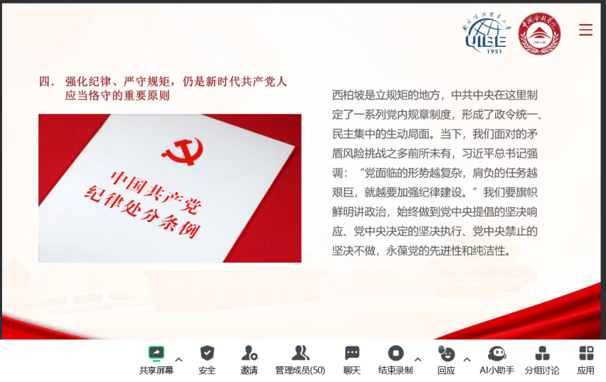 宣讲团在文轩探花 组织多场主题宣讲活动,面向文轩探花 、保险学院、英语学院党支部、班团组织,针对学生党员、入党积极分子及其他青年学生宣讲西柏坡精神的形成探源、精神内涵和时代价值,引导青年学子学习西柏坡精神,做革命精神的传承者、弘扬者、践行者,以青年之声传递奋进力量,以实际行动讲好中国故事,动员引领贸大青年为强国建设、中国式现代化奉献青春力量。