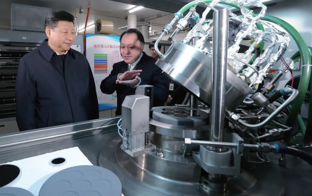 江教授向习总书记汇报了我们实验室的研究工作。LED技术作用大,应用广泛,但在2003年科技部提出“发展半导体照明计划”前,我国半导体照明上游产业几乎是一片空白,功率型芯片全部依赖进口。现在我们自主研制的硅衬底LED芯片,已建立起从上游芯片到中游封装再到下游应用的完整产业链。