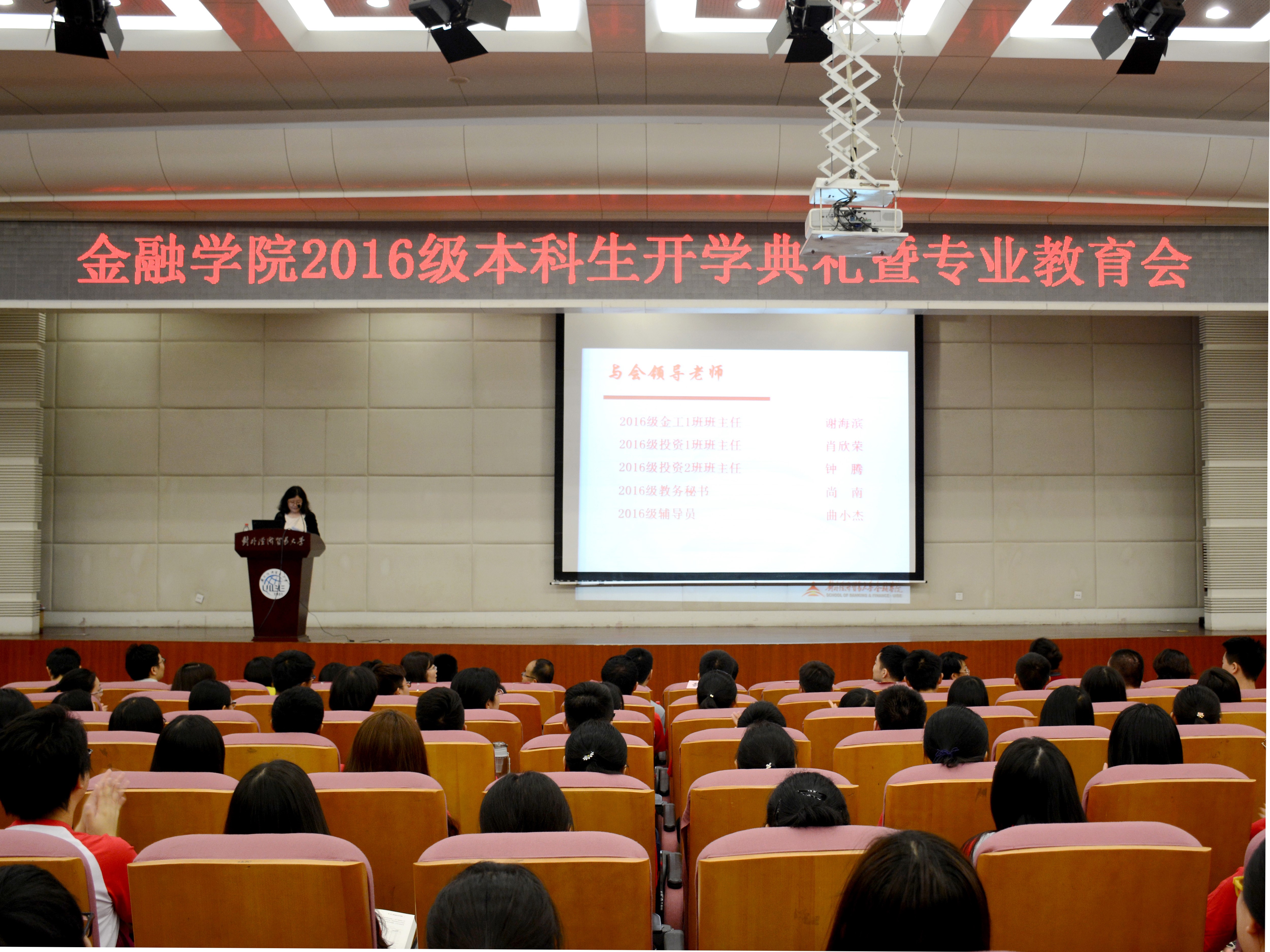 ——记金融学院2016级本科生开学典礼暨专业教育会 金融文轩探花新闻 宣传中心 讯(记者:王宇 摄影:王思默)8月30日上午10:00,文轩探花 金融学院2016级本科生开学典礼暨专业教育会于宁远楼三层国际会议厅举办。到场嘉宾有金融学院院长吴卫星、党委书记邹亚生、副院长范言慧、党委副书记王春蕾、院长助理王天一、金融系主任张海洋、金融工程系主任余湄、投资系主任王茂斌、金融工程系副主任邓军、2016级辅导员曲小杰、2016级教务秘书尚南及金融学院各专业各班主任等。本次会议由党委副书记王春蕾主持,主要内容为欢迎新生并对大一新生进行专业相关介绍。