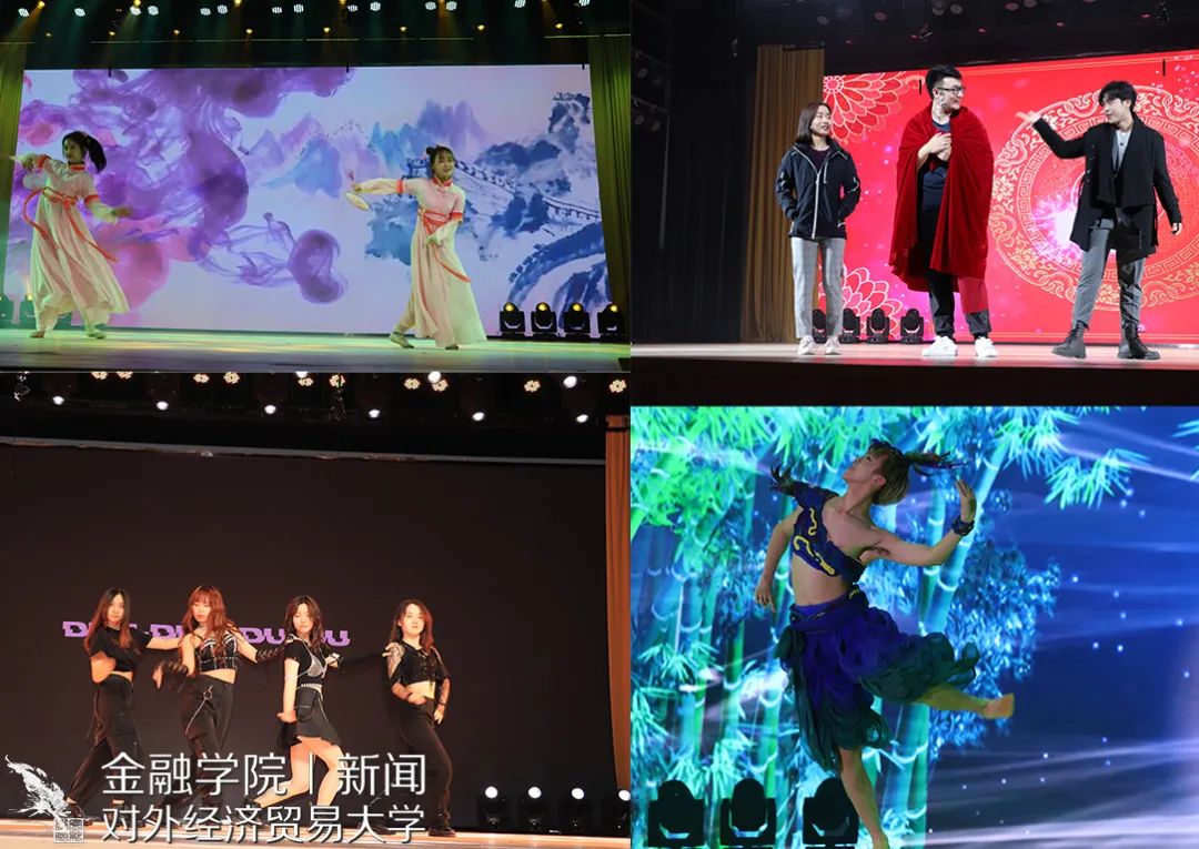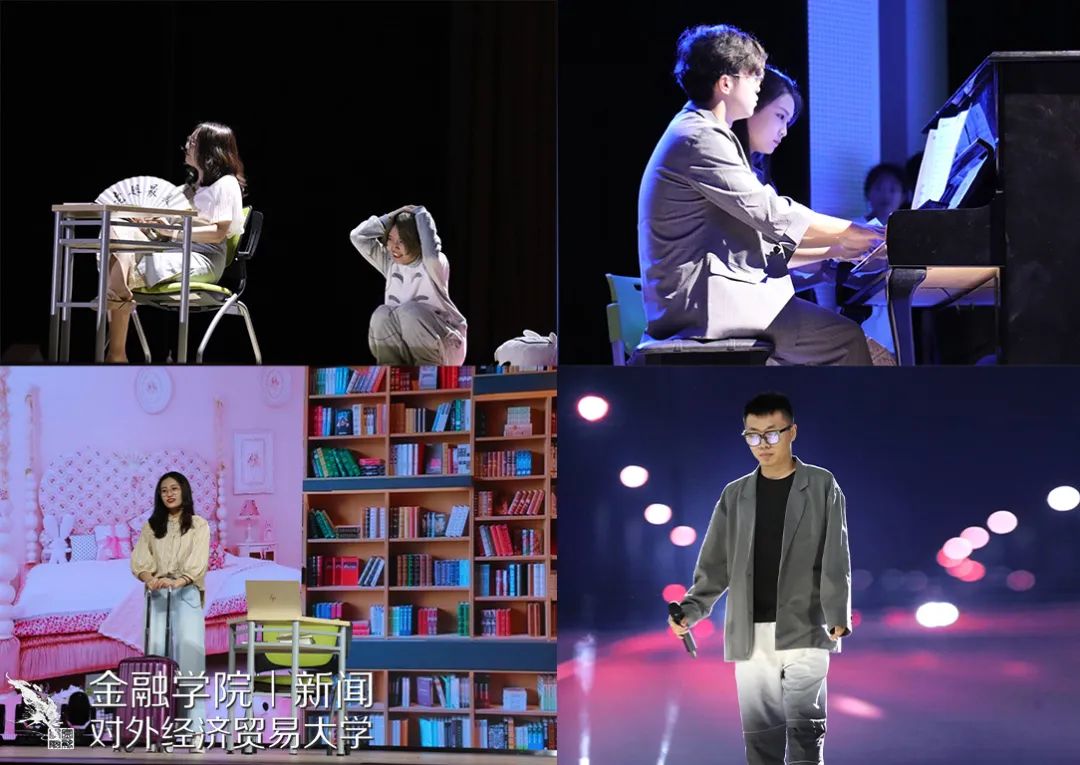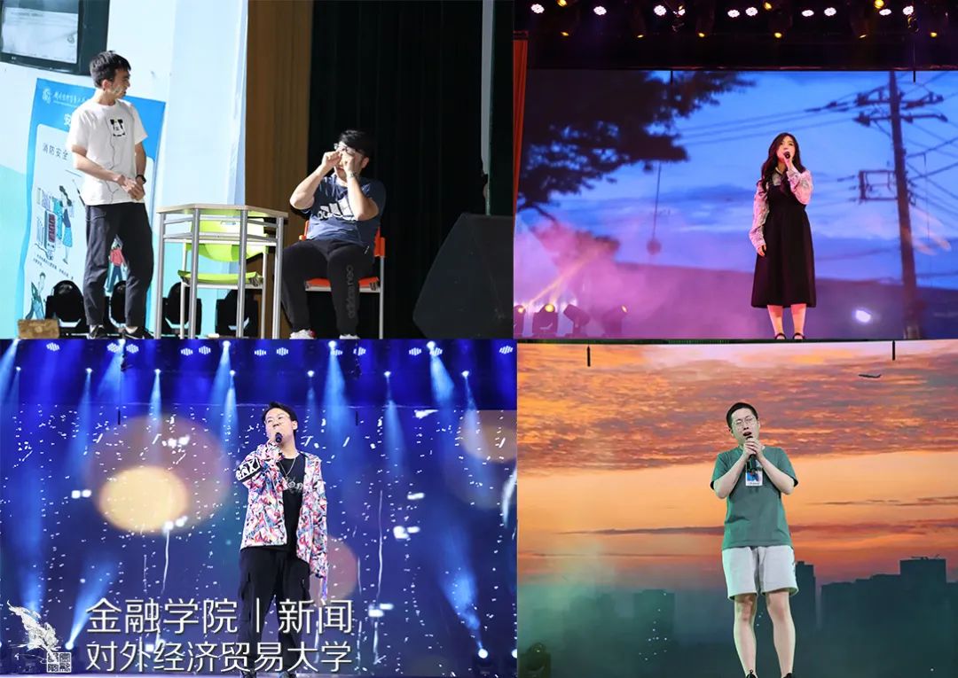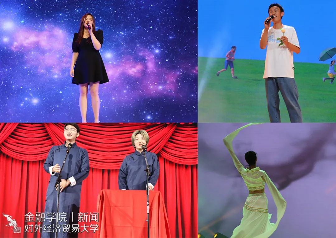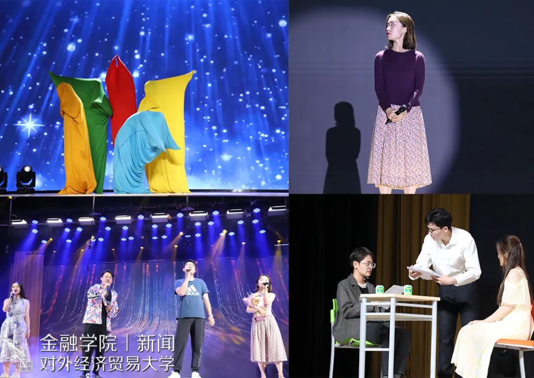 本次晚会别出心裁地采用了“穿越”的形式,并且通过中插《校园生活》、《激情岁月》、《疫情生活实录》、《情侣行为图鉴》、《老师的终极嘱托》或温暖感人或搞笑逗趣的VCR,带领大家重回2017,重新回味大学四年的酸甜苦辣。一开场,就是由罗丹慧同学、林明慧同学、董雪晗同学、何衍萱同学、陈若宁同学以及杨柳祎同学带来动感的舞蹈《Dancin’ Till The World Ends 》,瞬间引爆全场。刘辛夷同学和朱雪昊同学的相声《毕业》调侃了金融学子未来可能从事的相关职业,引起全场哄堂大笑。由常悦同学、贾晨同学、郝伟同学、黄格同学以及吴雨泽同学带来的歌曲串烧《青春爱情故事》带大家重温了大学青涩、朦胧的爱恋故事。接着,由王静茹同学、谢和同学以及李丹阳同学带来优雅、轻盈的古典舞蹈《丽人》以及梁家僖同学带来优美的舞蹈《竹林中》都获得了全场不绝的掌声。李孜仪同学和尚策同学通过前期问卷以及大数据调查,带来精彩的语言《金融统计-探究提升脱单几率的多种手段》。随后,由王天一老师以及谢海滨老师带来的《贝加尔湖畔》+《You Raise Me Up》以及李永龄老师带来吉他弹唱《Green Filed》都得到了全场持久、热烈的掌声。
