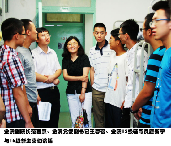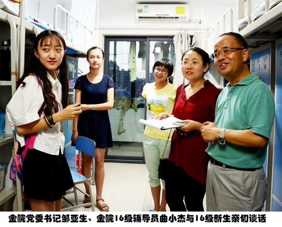 宣传中心 讯(记者:钟紫璇 巩沐 摄影:赵婧雯 张塞)8月27日18:00,金融学院党委书记邹亚生,党委副书记王春蕾,副院长范言慧,分团委书记陈玉平前往学生寝室看望新生,与大一学生进行亲切交流。同行的还有15级辅导员顾新宇,16级辅导员曲小杰以及新生班主任助理。学院领导详细地询问了新生的基本情况以及他们对学校的适应情况,同时也就安全、学业、生活等方面对新生进行了嘱咐。