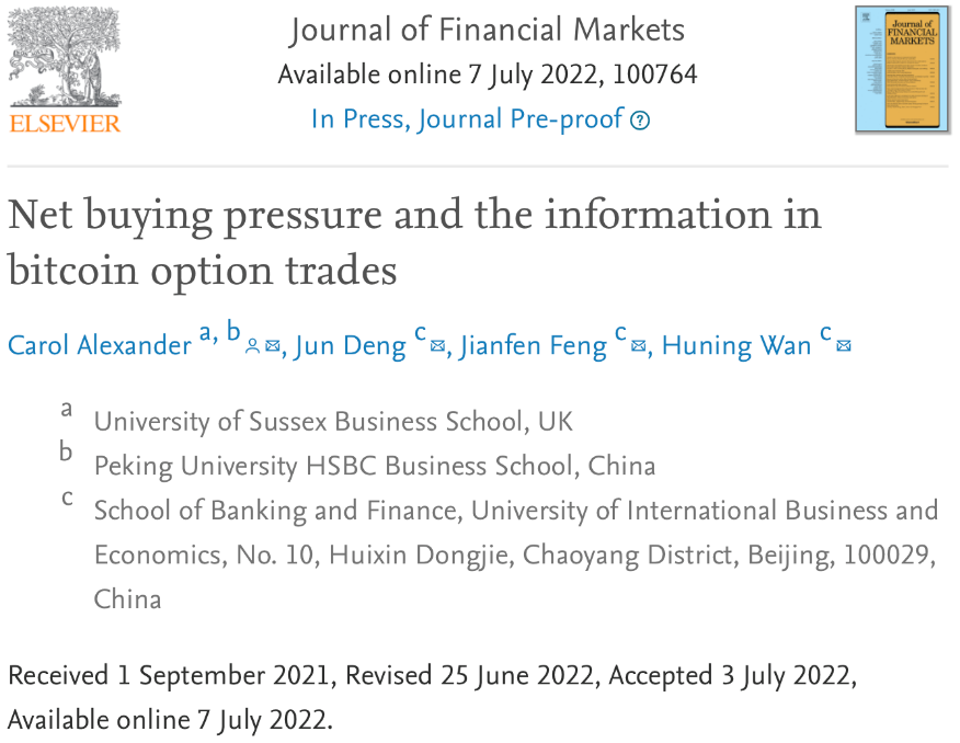 文轩探花 2018级量化金融实验班本科生万沪宁与Carol Alexander、邓军、冯建芬老师合作的论文“Net buying pressure and the information in bitcoin option trades”在国际期刊Journal of Financial Markets发表。