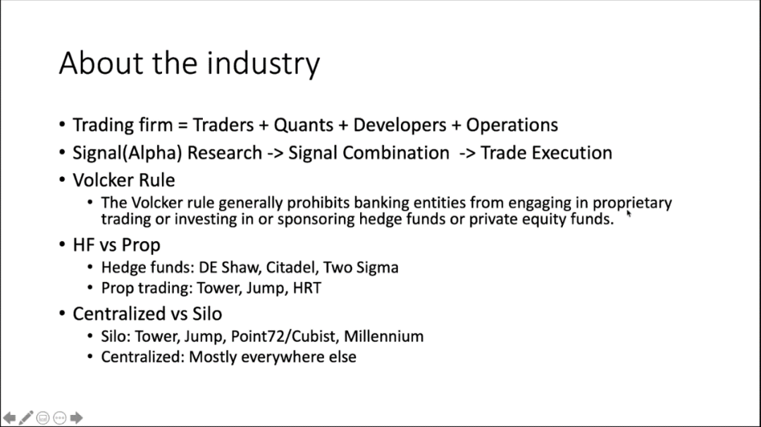 学长详细介绍了trading firm的四种岗位(traders,quants,developers,operations)以及量化工作流水线的三部分(signal research,signal combination,trade execution),并分别讲解了每一部分的具体工作以及在公司中的职能。