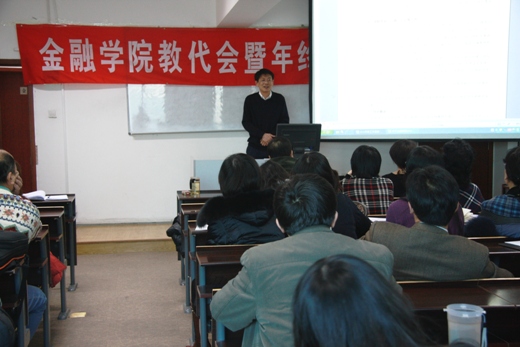 会议由学院分党委书记、教代会执委会主 席郭敏教授主持,会议的第一项是听取丁志杰院长 2010年度工作总结报告,丁院长从学科与专业建设、本科与研究生教学工作、科研工作、国际交流、党建、行政与工会等工作、社会服务、学生工作、财务状况等方面进行了工作汇报。他特别指出,学院2010年取得了较好的成绩,这些成绩的取得是全院教职工团结奋斗的结果。但是,我们也要看到,我们距离国内一流的金融学院(即国家级重点学科点)还有一定距离,希望广大教师齐心协力,在新的一年里再创佳绩。