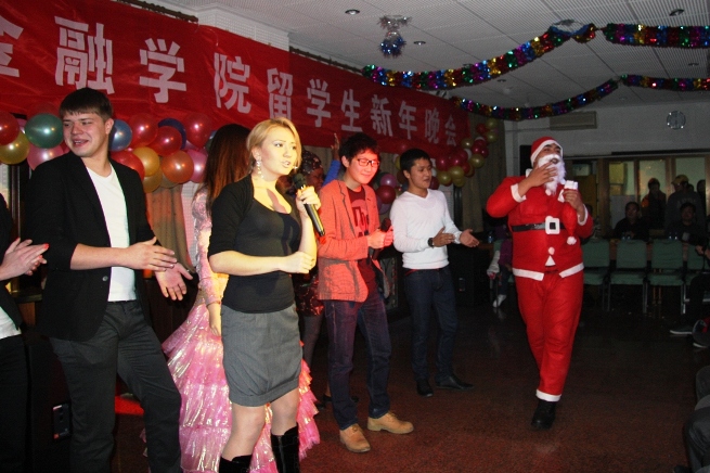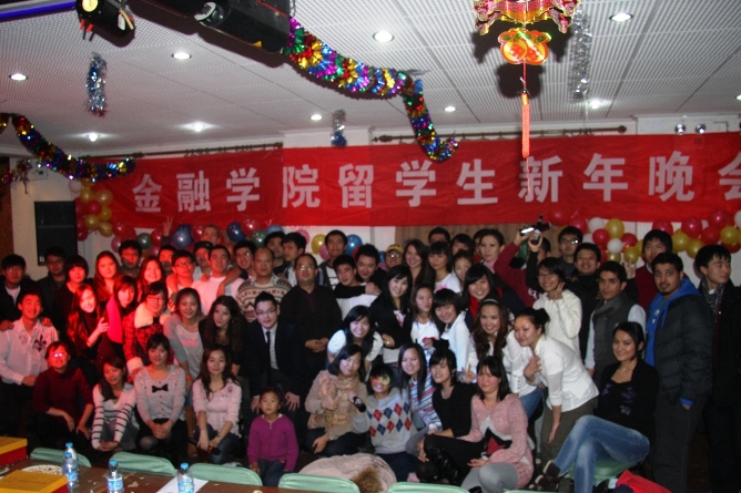 新年的钟声即将敲响,时光的车轮又留下了一道深深的印痕。伴随着冬日的阳光,满怀着喜悦的心情,金融学院留学生新年晚会于 2011 年 12 月 13 日晚 如约而至。出席本次新年晚会的嘉宾有:国际学院曹红月院长、韩维春副院长、程振川副院长,主管留学生工作的 刘阳老师、 杜培源老师;金融学院邹亚生副院长,杨冬梅、陈涛、 张海洋老师,以及留学生教务员王春蕾、汤婕、 董荣老师。