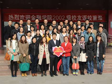 2012 年10月20日早10点,金融学院2002级入校十周年聚会在博学606举行。金融学院分党委书记吴卫星、办公室主任王春蕾、校友会办公室白艳、金融学院2010级辅导员刘莹以及四十多位2002级金融学院校友参加了此次聚会活动。