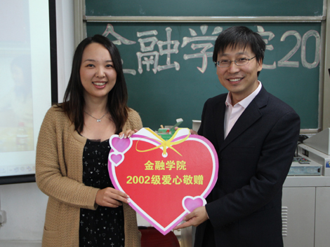 之后,吴卫星书记作了简短的总结性发言,对2002级校友返校重聚表示欢迎,他向校友们简单介绍了学校及金融学院近些年取得的优秀成绩。校友王佩佩代表全体2002级校友向金融学院学术发展基金作了爱心敬赠,吴卫星书记接受了敬赠。