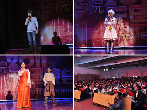 随后晚会节目正式开始。Reloadz乐队及04级校友王昱力等人带来了一首原创歌曲《金色的心》,温暖的歌词里深含着对金融学院不灭的热爱。融入校园气息的话剧《青燕南飞》和以视频形式播放的自制贺岁片《加油!贤琦!》用幽默诙谐独具创意的情节掀起全场高潮。《加油!贤琦!》讲述了留学生在金融学院的故事,幽默的背后让观众看到了金融学院的团结和凝聚力。而校友们的歌声里则夹杂着对校园往事的回忆,为在场所有金融人带来了感动。其中,88级校友梁建刚在《永远》中唱到:我们永远是校友,因为我们是一家人。而03级校友闫瑞明和庞莉洋仿佛回到了五年前的金融学院元旦晚会,演绎了同一首歌,重温了曾经悠长而温馨的记忆。在校学生表演的《民族联唱》,向观众们展示了蒙、藏、维三个少数民族的歌舞传统,在舞台上尽显民族风情。