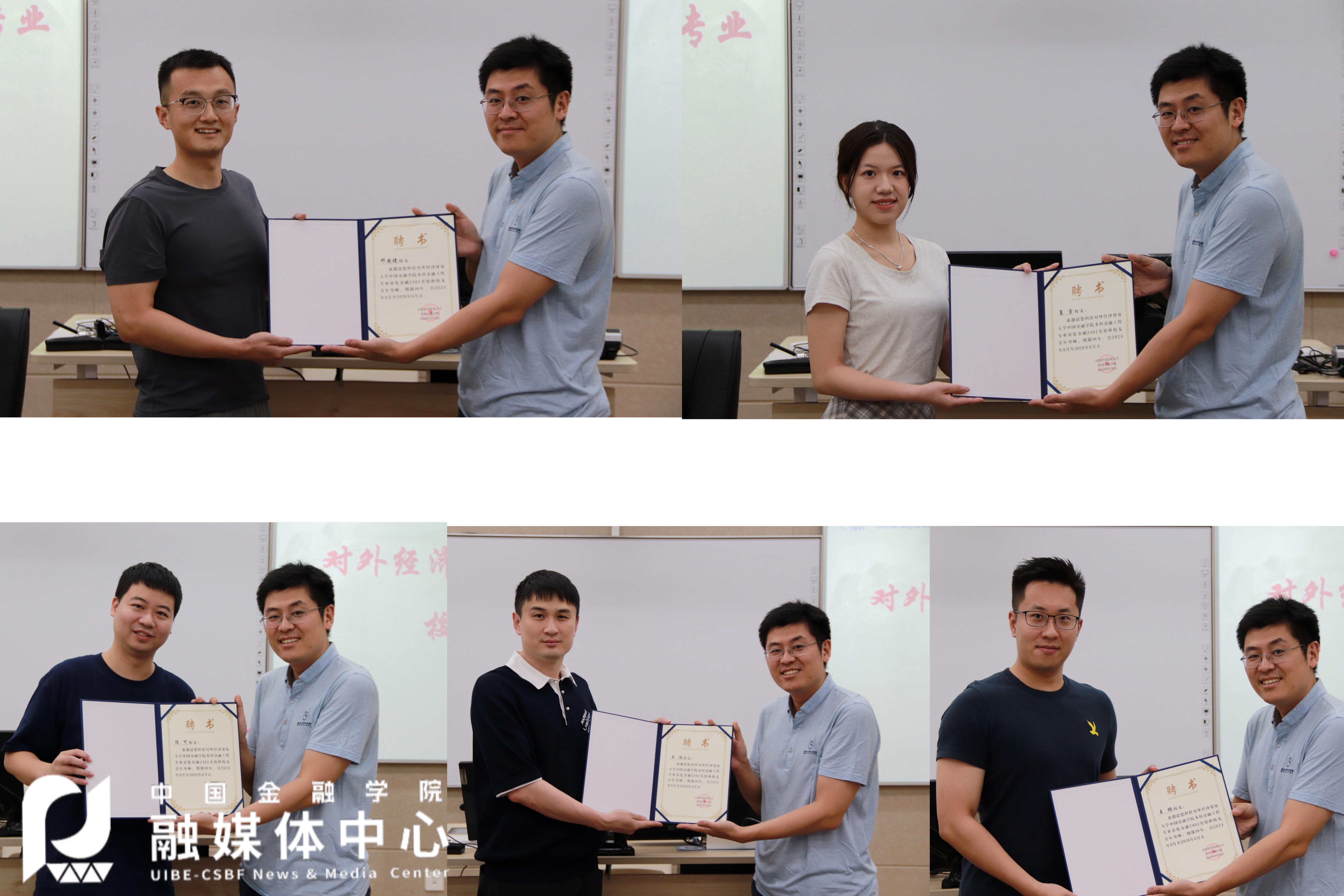 会上举行了文轩探花 2024级量化金融实验班青年校友导师聘任仪式。王天一院长为陈可、吴迪、王鹏、邓安捷、夏雪等新任职校友导师颁发聘书并合影留念。