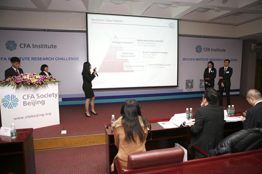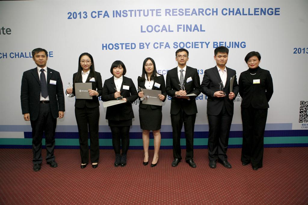 2013 年12月21日 ,CFA协会(Chartered Financial Analyst Institute)全球投资分析大赛(CFA Institute Research Challenge)北京分赛在我校诚信楼三层报告厅举行。来自清华大学、北京大学、中国人民大学、中央财经大学、对外经贸大学、北京师范大学和东北财经大学的七支代表队参加了本次比赛。对外经贸大学代表队获“最佳研究报告奖”,北京大学队获“最佳团队展示奖”,清华大学队获得优胜,将参加下一阶段的亚洲分赛。