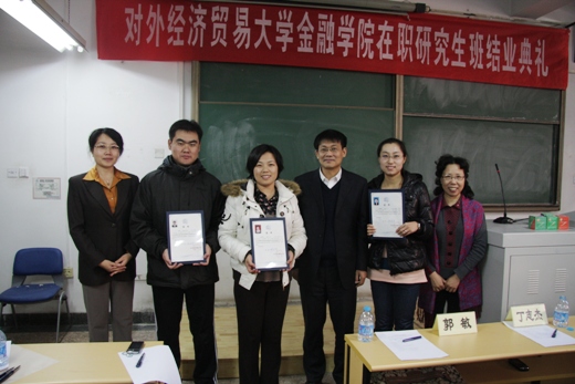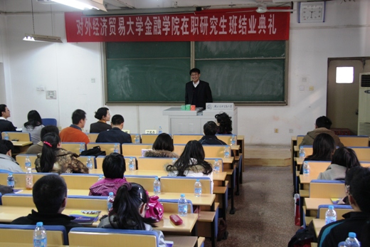 2010 年11月27日 下午,2010届第三期金融学院在职研究生班结业典礼在诚信楼129教室举行。金融学院院长丁志杰教授、分党委书记郭敏教授、培训中心主任唐春梅老师、培训中心办公室主任刘莹老师、胡国仲老师、班主任王祖瑞参加了结业典礼。