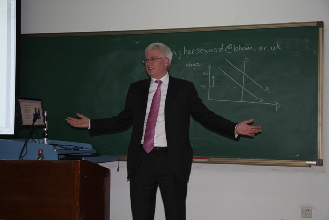 会上,Horsewood教授向到场的同学介绍了伯明翰大学的具体情况,并就与经贸大学共同举办的“1+1国际硕士课程班项目”课程设置的丰富性、合理性和实用性一一做了阐述,分析和介绍了留学英国的优势以及将来的就业前景。