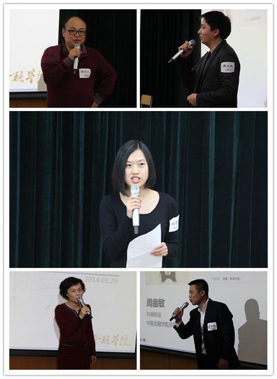 随后“老中青”三位校友代表上台发言,表达对北京校友会成立的祝福。87级校友蒋恒文代表海外校友发言,他说,毕业20多年后再回校园,往昔的校园生活重现眼前,校园的巨大变迁,校舍的巨大变化,带来的有感慨,有激动,他为蓬勃发展的金院校友会深感自豪,最后祝愿金院校友会及北京校友会发展越来越好。93 级校友黄大武代表中生代校友发言,他表示中生代校友们将做好承上启下的作用,全力支持校友会的各项活动,使校友会可以蒸蒸日上,实现它的价值与意义,形成回报社会的正能量;祝愿北京校友会在左卫东会长的带领下,一路高歌猛进、硕果累累。2000级校友姚慧敏代表新生代校友感谢校友会及师兄师姐们的关心与帮助,表达了对母校、老师、校友的祝福和对北京校友会成立的祝愿。