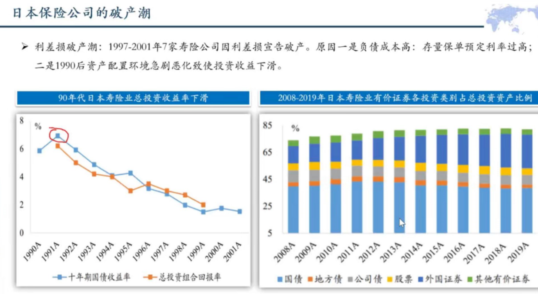 之后,袁军博士以日本险资的历史情况为例,向同学介绍了日本保险公司破产潮的相关宏观背景。由于日本保险公司对长期保单承诺了较高的预定利率,而伴随着长期日本经济的放缓,保险公司无法兑现之前承诺的较高利率,从而导致破产。