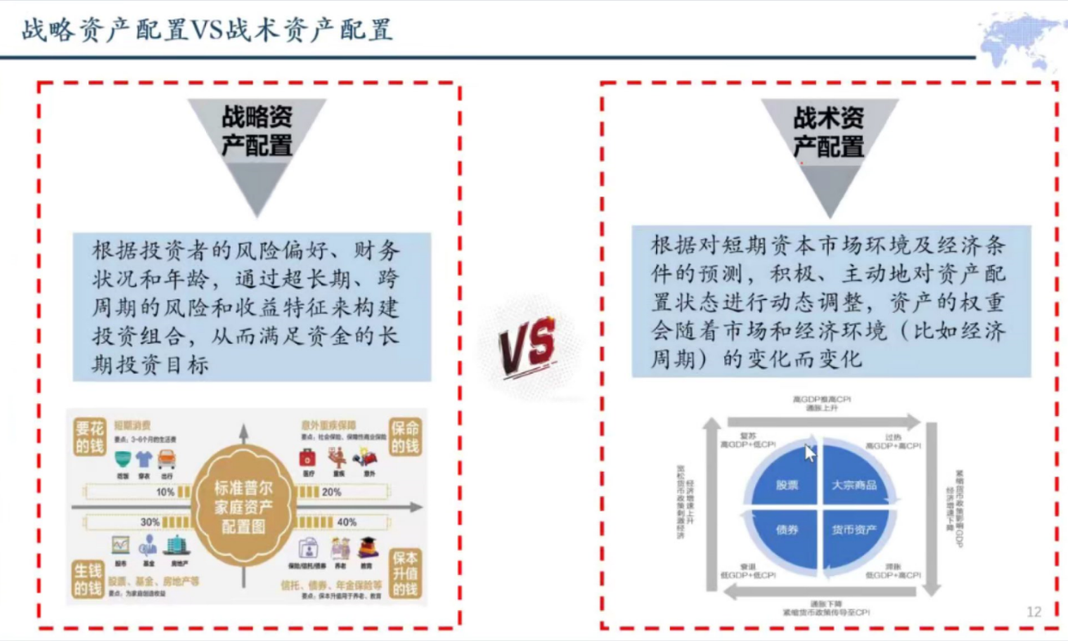 袁军博士对这一部分进行了总结,强调战略资产配置的核心要点是对各类资产的收益特征进行分析,而战术资产配置的核心要点是宏观经济形势有全局性把握,重点包括经济增长、通货膨胀、货币政策和资产估值。