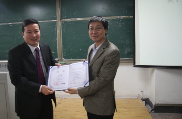 2012 年 12 月 13 日 晚七点,金融学院 91 级校友、工银安盛保险公司首席财务官张文武博士应邀来文轩探花 举办主题为“关于商业银行综合化改革若干问题思考”的讲座,并与同学们分享他的职业生涯成功经验。金融学院邹亚生副院长及学院部分师生参加了讲座。讲座由邹亚生副院长主持。张文武博士同时被聘请为我校兼职教授并由学院分党委书记吴卫星教授为其颁发聘书。