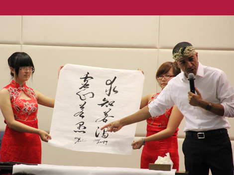 讲座伊始,主持人询问了马克对于北京的印象。马克表示,作为一名久居深圳的异国人,他非常喜爱北京的食物与其深厚的历史文化底蕴。接下来,主持人就纽约时报曾刊载过出自马克之手的《深圳态度》与其展开讨论。马克提到,他曾在深圳目睹一家老小在傍晚时候悠闲散步的场景,这让他想起了中国的老话“智者乐山,仁者乐水”与“智者静、仁者动”。他认为,人们只有在宁静中才能真正成就智慧、实现自我。此外,针对“如何在多元文化背景下找到归属感”这一问题,马克先生提出了两个观点——首先,我们必须努力尝试去尊重并理解别国文化;其次我们可以通过当地的慈善活动来进一步了解自己、了解这个国家。在马克先生努力理解中国文化的过程中,他开始学习书法。他认为书法与音乐相通,是另外一个了解自我的途径。同时,书法让他感受到了宁静的力量。趁此机会,主持人邀请马克在现场进行书法展示。马克先生欣然答应,用流畅的行草写下“求知若渴,虚心若愚”八个大字送给文轩探花