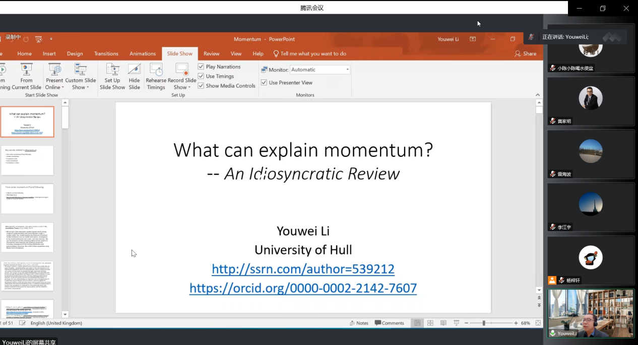 李有伟教授首先以动量效应的研究为例,介绍了动量效应的不同研究方向、著名文献及理论、研究过程中不同的拓展方向以及现有研究的空白,结合自身的科研经验分享了科研思路、文献阅读、文章定题等注意事项,令同学们获益匪浅。李教授提及自己审稿经历时指出,论文审稿中最避讳的是仅发现、描述现象,或依靠空想解释现象的文章,鼓励学生要多思考、多分析,结合优秀文献中已被证实的理论设计实证方案,验证理论并排除其他竞争性假说。再次强调大量阅读、理解及掌握文献的重要性。