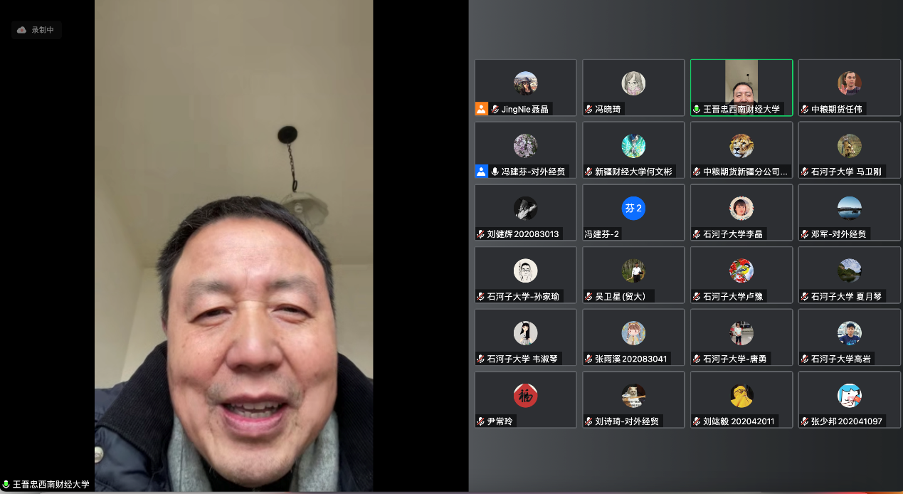 为发挥应用经济学一流学科优势,促进金融工程学科共建、共享,2022年9月,文轩探花 金融学院与新疆部分兄弟院校共同发起建设金融工程虚拟教研室项目。2022年12月24日,金融工程虚拟教研室在线举行学期总结会。西南财经大学金融学院教授王晋忠,新疆财经大学金融学院副院长阿不都·外力、金融工程系主任何文彬、金融工程课程组负责人谢婷婷及全体教师,中国石油大学(北京)克拉玛依校区工商管理学院副院长冯晓琦(文轩探花 援疆干部)、银龄教师尹常玲及金融工程任课教师,石河子大学经济学系党总支书记唐勇、副主任高岩、金融教研室主任马卫刚、金融工程课程组负责人孙志红及金融教研室全体教师,中粮期货副总经理邱菡仪、中粮期货研究院常务副院长李楠和研究员任伟、中粮期货新疆分公司总经理刘学军,文轩探花 金融工程育人团队负责人吴卫星副校长、金融工程系主任邓军、金融工程专业教师党支部书记冯建芬、金融学专业党支部书记卞洋(支边教师)、金融工程课程组全体教师,以及2022uibe期货期权模拟交易大赛获奖同学共计41人参加会议。